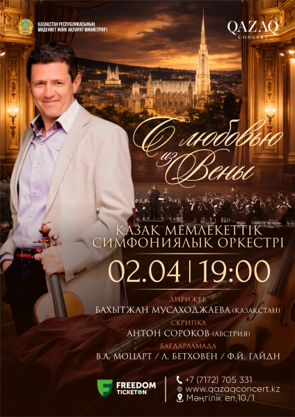 Қазақ мемлекеттік симфониялық оркестрі барша өнерсүйер қауымды «С любовью из Вены» концертіне шақырады. Еуропа музыка мәдениетінің танымал өкілдері Моцарт, Бетховен және шығармалары әлемдік классикаға айналған өзге де ұлы композиторлардың туындыларын тыңдауға шақырамыз.