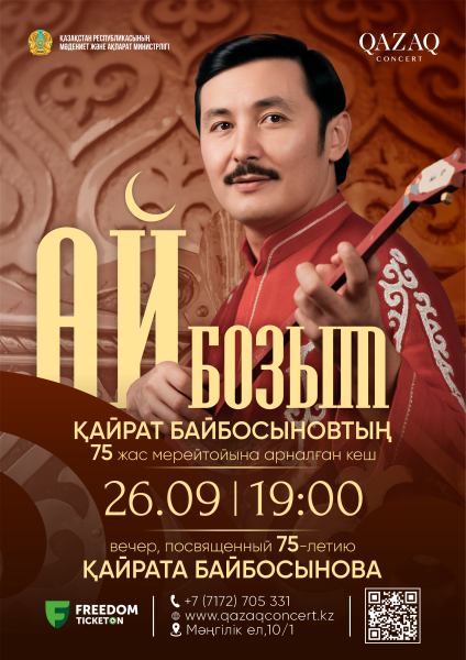 Қазақконцерт сіздерді дәстүрлі әнші, қазақ ән өнерінің дарабозы және абыз тұлғасы, Қазақстанның Халық әртісі, Еңбек Ері, Мемлекеттік сыйлықтың лауреаты Қайрат Байбосыновтың 75 жылдық мерейтойына арналған «Айбозым» атты музыкалық кешке шақырады.