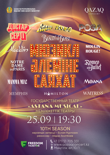 Алда жаңа белес! «ASTANA MUSICAL» мемлекеттік мюзикл театры оныншы маусымдық кезеңді атап өту мерейтойына орай арнайы мерекелік кешке шақырады. Бұл кеш - өнер мерекесі, нағыз триумф!