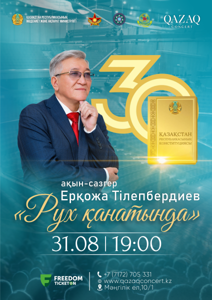 Роза Бағланова атындағы Қазақконцерт 2025 жылғы 31 тамыз күні сағат 19:00-де ҚР Конституциясының 30 жылдығына арналған Қазақстан Жазушылар одағының мүшесі, ақын-сазгер, Мәдениет саласының үздігі, республикалық, халықаралық патриоттық әндер конкурстарының лауреаты Ерқожа Тілепбердиевтің «РУХ ҚАНАТЫНДА!» атты шығармашылық кешіне шақырады.
