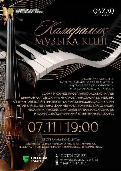 Қазақконцерт сүйікті көрермендерін камералық музыка кешіне шақырады. Кеш барысында тыңдарман қауым орындаушылық шеберліктің жаңа толқынын таныстырып жүрген жас таланттардың өнеріне тәнті болады.