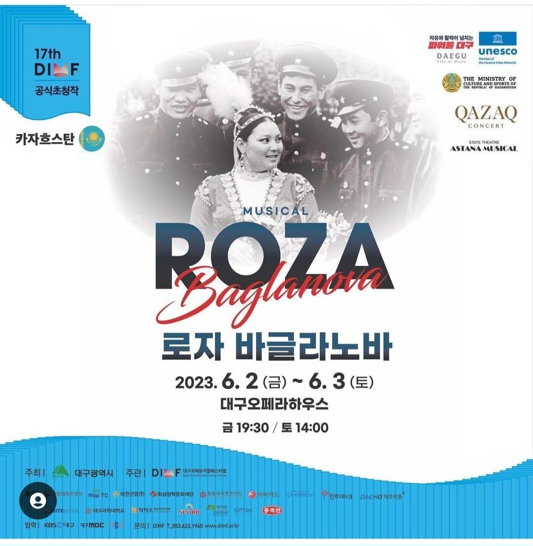 Государственный театр «Astana Musical» являются официальным приглашенным гостем 17-го международного фестиваля мюзикла в Тэгу (DIMF) (Юж.Корея) и выступят с мюзиклом «Роза Бағланова».