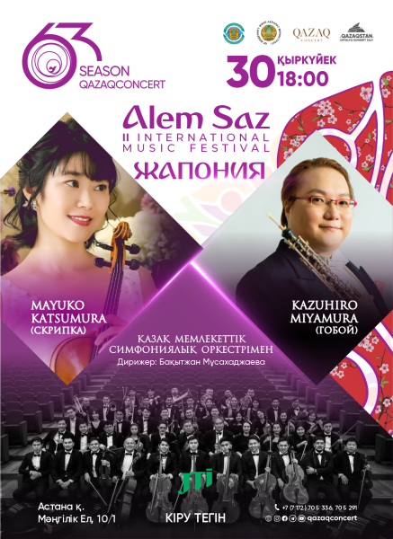 На музыкальном вечере в рамках II международного фестиваля известные японские музыканты Маюко Кацумура и Миямура Кадзухиро представят публике основные жанры классического и современного искусства. В концертной программе прозвучат популярные произведения японских и казахстанских композиторов.