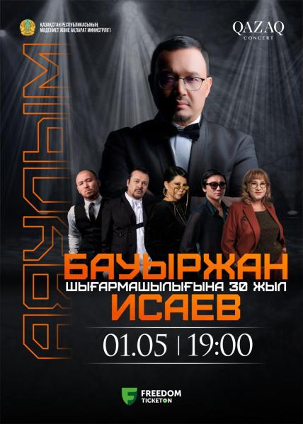 Қазақконцерт танымал әнші, «Ерен еңбегі үшін» медалінің иегері Бауыржан Исаевтың шығармашылығына 30 жыл толуына арналған «Аяулым» атты музыкалық кешін өткізеді.